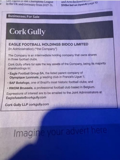 No anúncio, a empresa informa possuir participação no Botafogo, descrito como “um dos clubes mais históricos do Brasil”, além de ativos em equipes como Lyon e RWDM Brussels. A Cork Gully afirma que “coloca à venda os principais ativos da empresa, nomeadamente as suas participações maioritárias”.