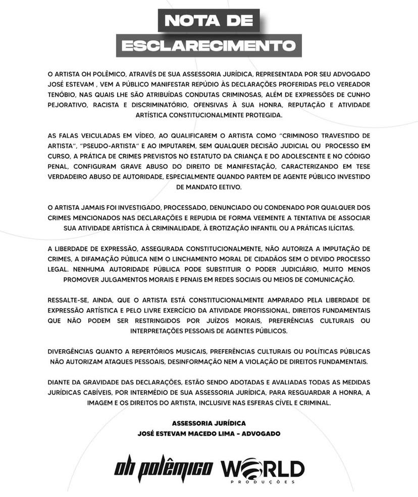 Em resposta, a assessoria de Oh Polêmico negou qualquer investigação, processo ou condenação envolvendo os crimes citados e reforçou que divergências sobre repertório musical, preferências culturais ou políticas públicas não justificam ataques pessoais ou desinformação.