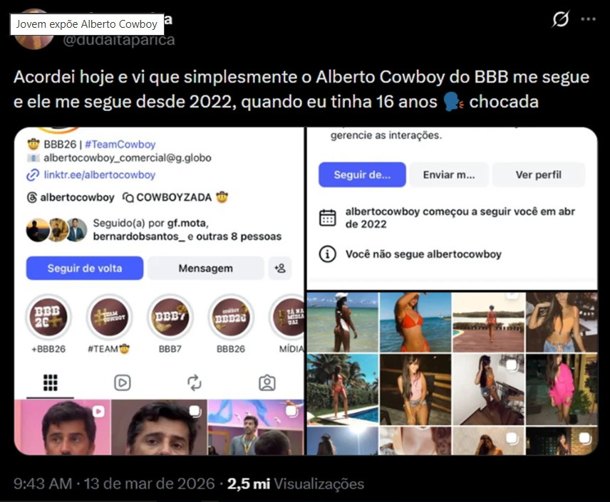 A estudante de Direito Duda Itaparica, de 20 anos, usou o X (antigo Twitter) para relatar que Alberto Cowboy, atualmente confinado no Big Brother Brasil 26, a seguia nas redes sociais há cerca de quatro anos. Segundo a baiana, o brother chegou a curtir fotos suas quando ela tinha apenas 16 anos.