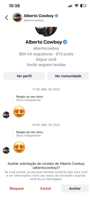No relato publicado na rede social, Duda Itaparica também compartilhou prints que mostram reações de Alberto Cowboy aos seus stories, incluindo um emoji de rosto com olhos de coração. Após a publicação ganhar grande repercussão na internet, a estudante afirmou que passou a receber ataques e ameaças de homens nas redes sociais.